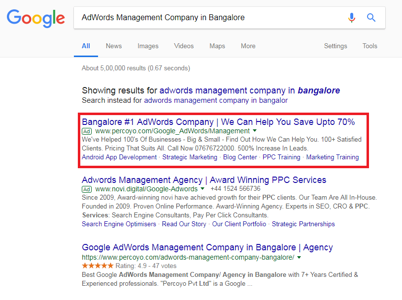 Eg: When a user searches for a keyword in the Google Search Engine “AdWords Management Company In Bangalore”.